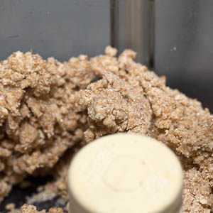 Place the flours, brown sugar, and salt in a food processor bowl and process until well-combined and no sugar lumps remain, 15 to 20 seconds. Scatter the butter pieces over the flour mixture and pulse to a coarse meal, about fifteen 1-second pulses. With the machine running, pour the milk mixture through the feed tube and continue to process until the dough chases itself around the bowl and will hold together when pinched between fingers (fig. 2.1), about 10 seconds.