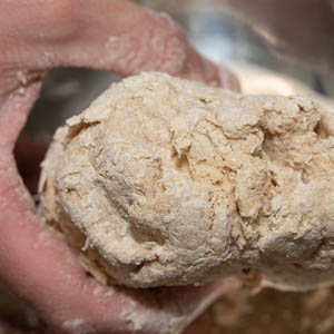 Fill a teakettle with water and warm it to 120 degrees. Pour 290 grams of the water into a large bowl, then add both flours. Work the ingredients together by squeezing with your dominant hand until the flour begins to hydrate and a shaggy dough forms (fig. 1.1). The mixture will be very stiff and will take time to hydrate completely. Keep squeezing until the dough starts to come together into a ball (fig. 1.2). Grasp the ball and use it to wipe the sides of the bowl. Turn the dough and any remaining flour onto a clean work surface and knead the until the dough shows no dry bits of flour and is completely smooth, about 3 minutes (fig. 1.3). Place the dough in a clean medium bowl, cover tightly with plastic wrap, and let rest for 20 minutes.