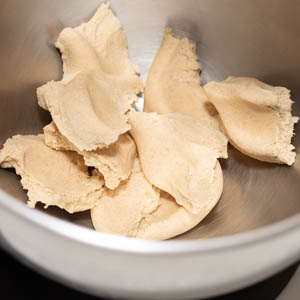 Break the dough into rough 1½-inch pieces and drop them into the bowl of a stand mixer (fig. 2.1). Add the avocado oil and salt, then attach the bowl and the flat-beater attachment to the mixer. Mix on low speed until the oil is fully incorporated and the dough is a nice, neat cohesive mass, 3 to 5 minutes.