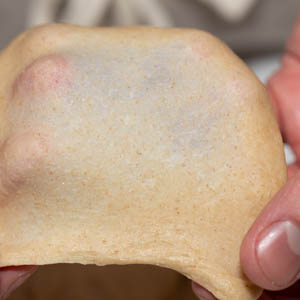 Turn the dough onto a clean work surface. Knead it by hand, without adding additional flour, for about 3 minutes. Break off a 2-inch piece and, holding it aloft with both your hands, gradually stretch it to a thin membrane. If the dough is adequately kneaded, it will stretch until translucent (fig. 3.1), and when it tears, it should do so cleanly. If the dough does not meet these criteria, continue to knead it and retest until it does. Place the dough in a clean medium bowl, cover tightly with plastic wrap, and let rest for 20 minutes.