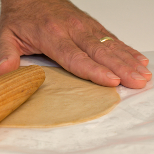 Place a dough ball between the 2 sheets of plastic and flatten it slightly with the palm of your hand. Position the tapered end of a French rolling pin in the center of the dough. Holding the end of the rolling pin in position at the center of the dough with one hand (fig. 6.1), roll away from you, pivoting from the center of the dough, until the rolling pin is about 45 degrees from the starting point. Rotate the plastic sheath clockwise about one-quarter turn and continue rolling and rotating until the dough is 8 to 9 inches in diameter. If you roll the tortilla too thinly in places, use a small offset spatula to smooth and even it out through the plastic.