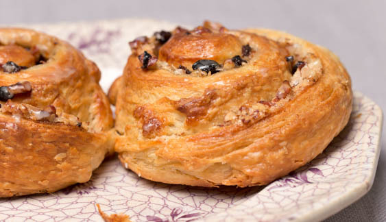 Schnecken, as their shape suggests, represent snails. Schnecken are made by rolling raw ripened Danish dough into a thin square sheet, then, in our variation, spreading the surface with a fluffy butter and sugar concoction called remonce. Currants and pecans are strewn lavishly on top, and the dough is rolled into a long cylinder like a carpet. Danes deploy remonce in nearly all Danish fillings owing to the cushion of moisture, flavor, and grip it offers the already extravagant dough and filling. Cut into thick pinwheel rounds, schnecken are set to proof. Once baked, schnecken are moist within, crisp without, and carry the flavors of chopped pecans and rum-doused currants into the flaky folds of a well-fermented, high-performance pastry.
