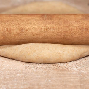 Final shape the dough: Lightly brush two plates at least 6 inches in diameter with olive oil. Dust another area of your work surface with flour. Using a metal bench knife, gently scrape up one dough ball and place it on the floured surface; keep the remaining pieces covered. Dust the dough with flour. Press the mid-section of a rolling pin into the center of the dough, then roll away from you (fig. 6.1). Reposition the pin at the center of the dough, then roll toward yourself; the dough should now be oval in shape. Rotate the dough 90 degrees and roll out in the same manner. Continue rolling and rotating until the dough is about 6 inches in diameter and about ¼ inch thick, dusting with only as much flour as needed to prevent sticking. Transfer the dough disk to one of the prepared plates, then lightly brush the surface of the dough with olive oil. Repeat with the remaining dough balls, stacking five disks per plate (fig. 6.2).