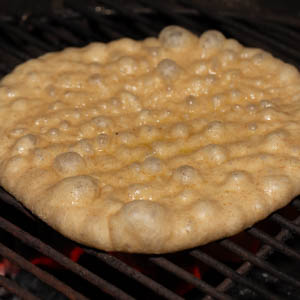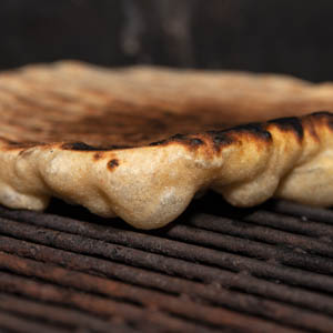 These flatbreads really come alive when grilled over charcoal, catching a smokiness that makes them taste ancient and authentic. But if you prefer, or must, cook the flatbreads indoors, use a 10-inch well-seasoned cast-iron grill pan on the stove top. After you divide the dough but before you final-shape the pieces, set the grill pan over medium-low heat and let it warm while you roll out the disks. Just before you place the first round into the pan to cook, turn up the heat to medium-high. The cooking time is the same as if grilling over a live fire.
