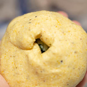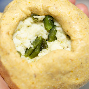 We are excited to be able to offer a recipe we think is as good or better than the best pupusas we’ve eaten. The mild roasted poblano chiles in the filling, while not strictly Salvadoran, bring the haunting specter of green chile into the melting cheese with riveting results. We use Henry Moore yellow hominy corn here (most restaurant pupusas are formed with white corn instant masa).
