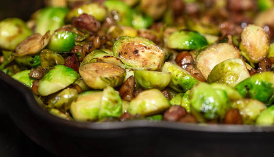 Set the skillet over high heat. Turn the sprouts into the hot fat and sear them, tossing only occasionally, until well browned, about 5 minutes. Avoid overzealous stirring—it will interrupt their browning. Add the garlic, farro, pecans, and bacon. Toss to combine and warm the farro, about 15 seconds. Taste for seasoning, adding salt as needed. Add the vinegar, maple syrup, and pepper, then toss to combine. Serve hot.