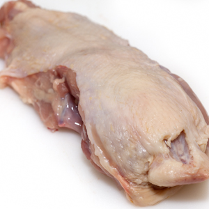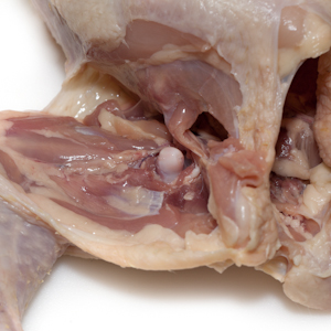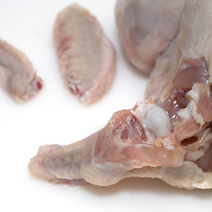 Using a sturdy chef’s knife, cut off the wing tips from the chicken; discard or reserve them for stock. Cut off each wing flat, then remove each drumette at the shoulder joint (fig. 2.1). Separate each leg from the body at the hip joint (fig. 2.2), then cut each leg into drumstick and thigh pieces (fig. 2.3). Cut through the ribs on either side of the backbone to separate the backbone from the breast (fig. 2.4); discard the backbone or reserve it for stock. Turn the breast skin side down and cut lengthwise, through the breastbone, to separate the breast into halves. Cut each breast in half crosswise (fig. 2.5). Add the chicken parts to the bowl, cover and refrigerate for 8 to 10 hours.