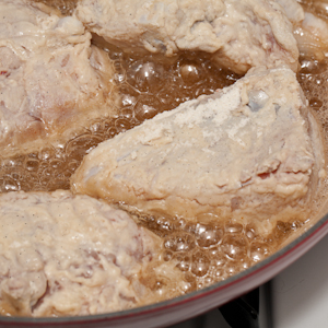 A dance of undulating temperatures, frying a chicken requires constant attention. Use a thermometer. The chicken enters the fat when the fat is between 360 and 365 degrees. After that, be ready to raise the temperature to compensate for heat loss and lower it again when the temperature races back. Optimum fat temperature should be around 350 degrees throughout. The chicken is turned once—and only once.