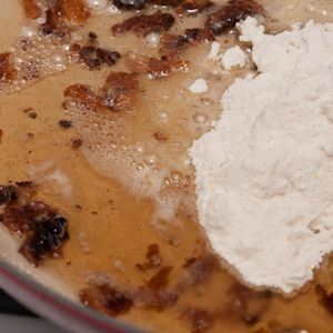 Make the gravy: Sprinkle the flour onto the hot drippings remaining in the skillet (fig. 8.1) and stir with a wooden spoon to make a smooth paste, or roux. Set the skillet over medium heat and cook the roux, stirring constantly, until it is molten and begins to color slightly, about 5 minutes (fig. 8.2). Whisk the hot stock into the roux in three additions. Add the bay leaf and bring to a simmer over medium-high heat, whisking constantly. Reduce the heat to medium and simmer gently for 5 minutes. Whisk in the buttermilk and simmer 5 minutes more. Season with salt and pepper and whisk in the butter. Strain the gravy through a fine-mesh strainer into a warmed gravy boat.