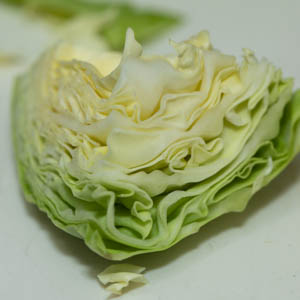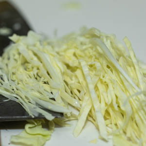 Using a very sharp chef’s knife, cut the cabbage in half from top to bottom. Remove and discard any tough or bruised outer leaves. Cut the cabbage halves into relatively small wedges (fig. 2.1), cut off and discard the core from each wedge, and shave the cabbage into thin ribbons (fig. 2.2). When you have 1 pound of sliced cabbage, turn it into the large bowl of brine. Mince the onion and turn 3 ounces of it into the smaller bowl of brine. Peel and trim the carrots, then shred them on the large holes of a box grater. Weigh out 6 ounces of shredded carrots and set them aside.