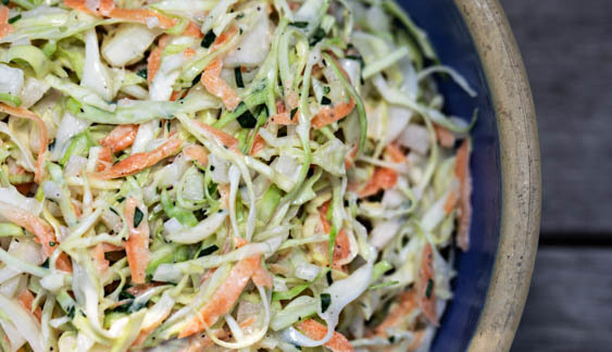 A good slaw needs a sharp well-balanced knife, as well as a careful knife operator. The food processor won’t produce this kind of slaw.